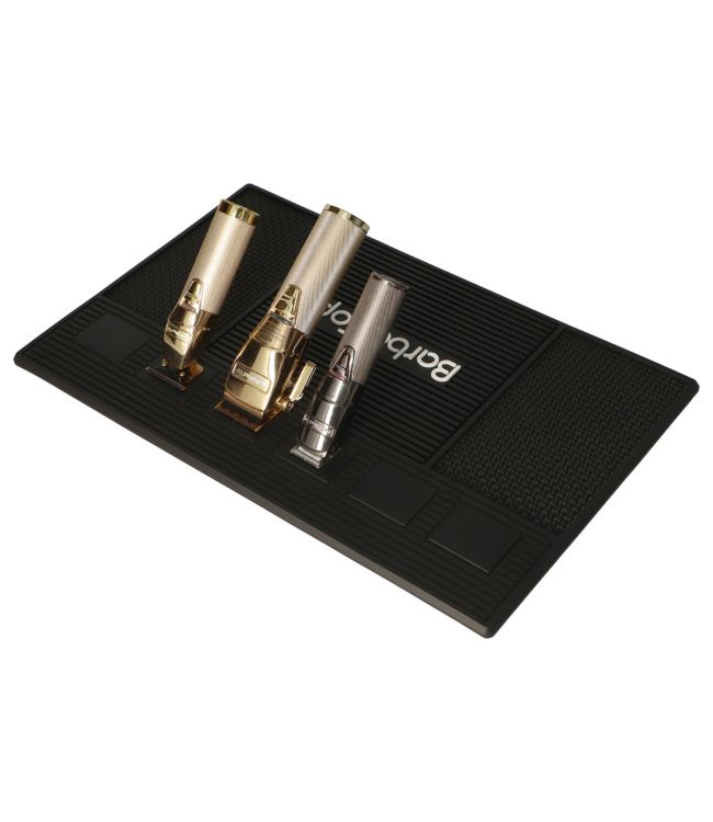 Barbermat met Magneten Zwart is een professionele mat met magneet vakjes voor het opbergen van tondeuses en trimmers. Deze mat is ideaal voor een opgeruimde salon of barbershop. Deze luxe mat heeft 6 magnetische vakken waarop trimmers en tondeuses opgeborgen kunnen worden. Zo kun je gemakkelijk en georganiseerd werken met jouw favoriete tools binnen handbereik. De mat is gemaakt van hoge kwaliteit zwart siliconen en volet zwaar en stevig aan. Naast de magneet vakjes heeft de mat ook andere getextureerde vakken waarop jouw tools neergelegd kunnen worden. Het materiaal is bestendig tegen hitte tot 150 graden, dus ook warme stylingstools kun je kwijt op deze mat. Deze mat is een absolute musthave voor iedere barbershop of kapsalon.