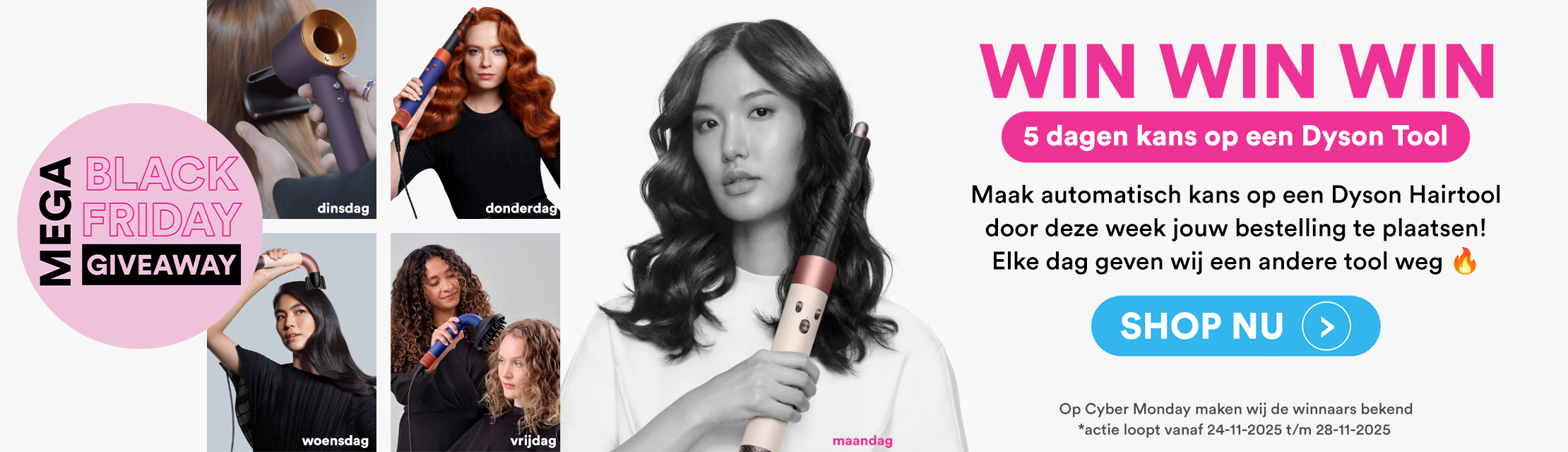 Our biggest giveaway ever! Tijdens Black Friday Week geven we niet één... niet twee... maar wel 5 Dyson Styling tools weg! OMG daar wil je natuurlijk kans op maken. Meedoen is simpel. Plaats op 24 t/m 28 november 2025 een bestelling en je doet automatisch mee. Elke dag maak je kans op een ander model van Dyson. Welke modellen mee doen? Dat lees je in dit blog over de Dyson winactie. Hou onze socials goed in de gaten en schrijf je in voor de nieuwsbrief om op de hoogte te blijven van deze gave winactie.