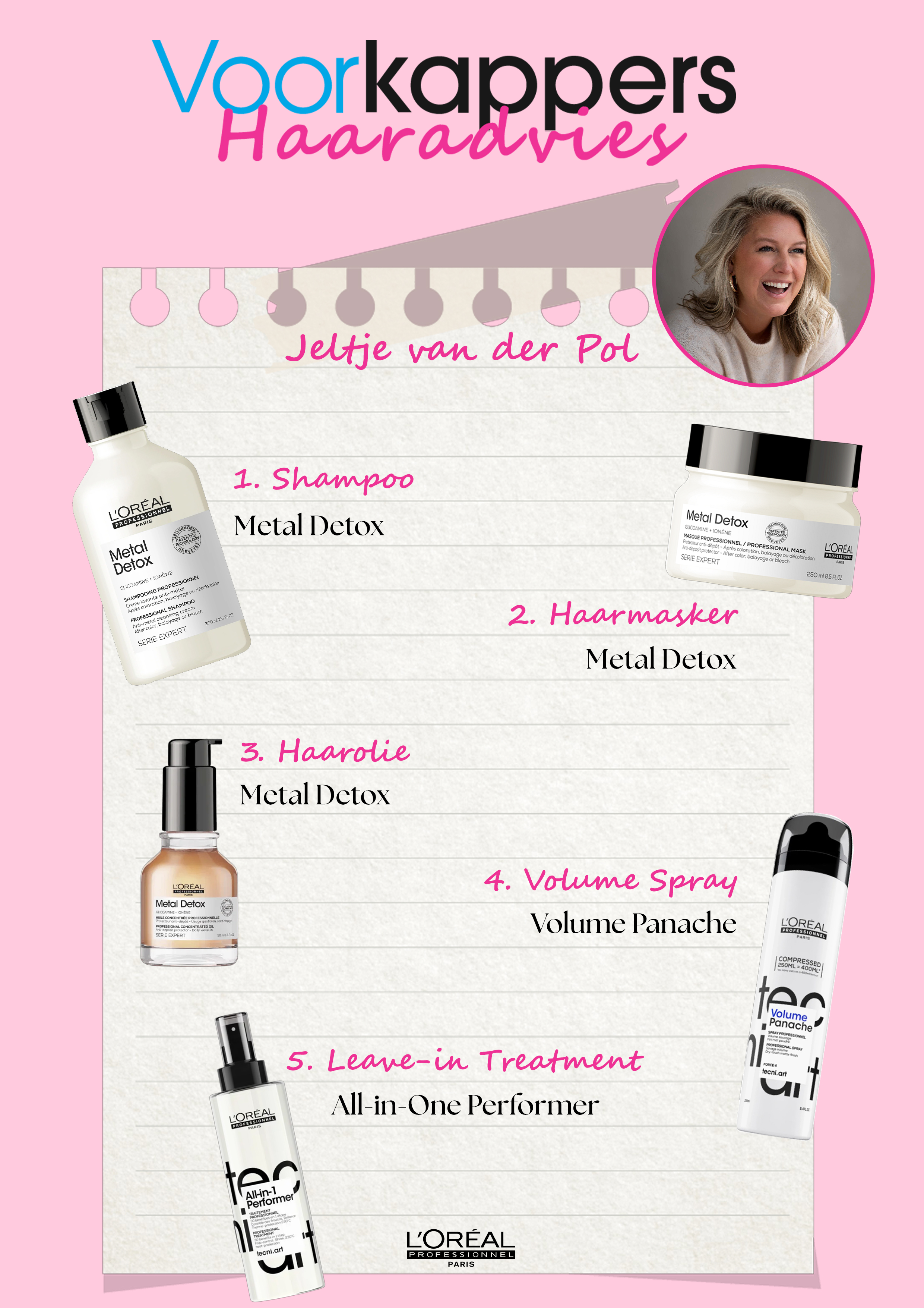 De experts van Voorkappers hebben met de producten van L'Oréal Professionnel de perfecte haarroutine samengesteld voor Jeltje. Hieronder kun je stap voor stap het haaradvies bekijken. Wil je ook producten van L'Oréal Professionnel shoppen? Gebruik code JELTJE10 voor 10% korting op het hele assortiment van L'Oréal Professionnel! Deze code is tijdelijk geldig op vrijdag 17 april 2026. Zie Jeltje's Instagram story voor de voorwaarden.