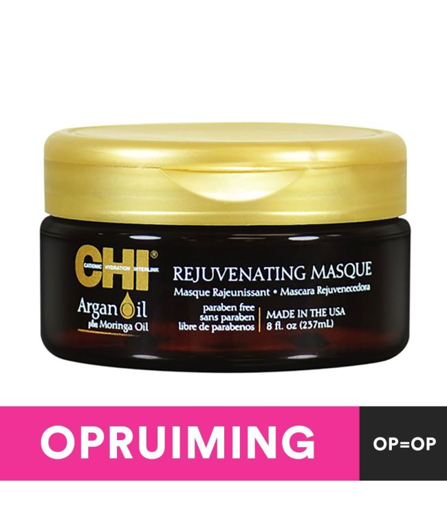 CHI Argan Oil Masker is een masker dat verrijkt is met argan olie en moringa olie, die het haar intens verzorgen. Het masker is rijk aan Vitamine A en C die ervoor zorgen dat het haar behandeld wordt en weerbarstig en beschadigd haar hersteld wordt. CHI Argan Oil Mask is geschikt voor beschadigd, droog en kroezend haar. Het masker bevat een systeem met vier delen die bestaan uit Vitamine E, omega vetzuren, essentiële oliën en vocht om het haar direct en intens te voeden. Het haar zal glad en pluisvrij zijn, en een ongelooflijke glans hebben. Dit masker bevat geen parabenen.