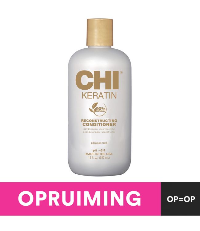 Chi Keratin Reconstructing Conditioner 355ml beschermt de natuurlijke keratine proteïne van het haar en vult deze aan, voor een verbetering van de elasticiteit. Chi Keratine Conditioner herstelt je beschadigde haar en maakt het heerlijk zacht. Door de keratine aan te vullen wordt beschadiging in de toekomst ook voorkomen. De formule is verrijkt met essentiele jojoba-olie en arganolie die diep door in het haar dringen, glans geven en het haar versterken waardoor je haar minder snel breekt. Is je haar droog of kwetsbaar geworden door het gebruik van hete stylingtools of veel stylingproducten? Dan is het hoognodig toe aan een dosis keratine! Formule is vrij van parabenen. Gemaakt van 90% natuurlijke ingrediënten.