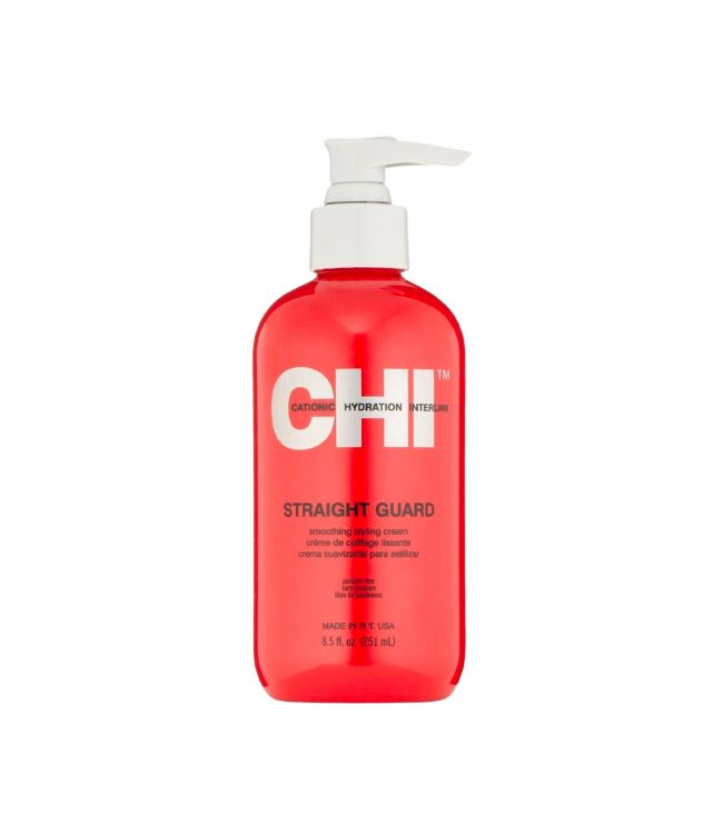 Chi Straight Guard Smoothing Styling Crème 251ml is een gladmakende en verzorgende crème van CHI voor ieder haartype. De crème is vooral geschikt om krullen en haar met slag stijl te maken. CHI Straight Guard maakt van kroezend en krullend haar zachte en sluike styles. De crème-achtige basis geeft ongelovelijk veel controle en glans. Het haar wordt moeiteloos kambaar met de borstel tijdens het fohnen. Daarnaast wordt het haar ontdaan van pluis, is het soepeler en gemakkelijker in model te krijgen. De formule is vrij van parabenen.