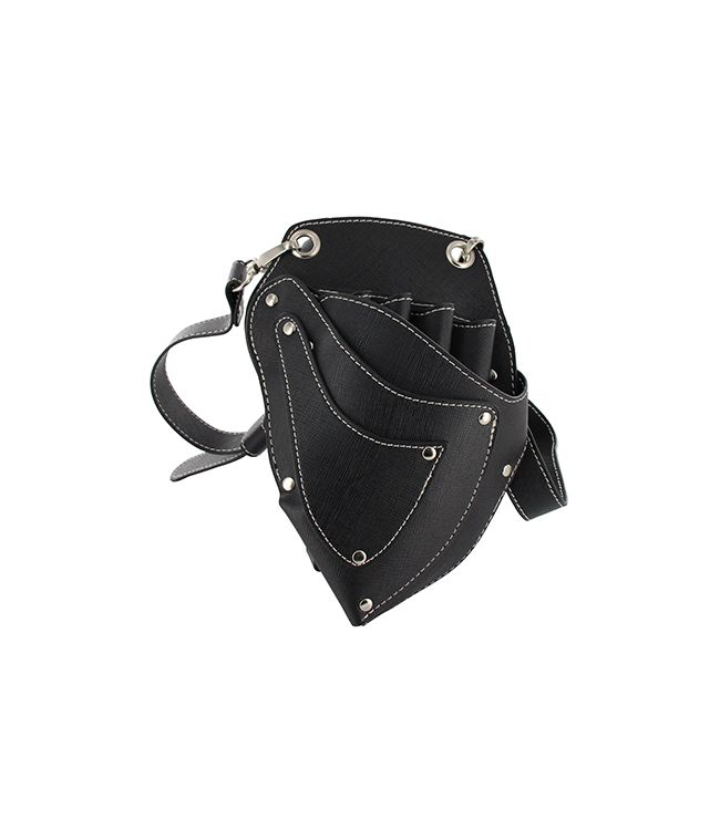Zwarte lederen heup holster voor scharen en kammen Het heup holster is eenvoudig om het middel vast te maken. Zo heb je je tools altijd bij de hand.
