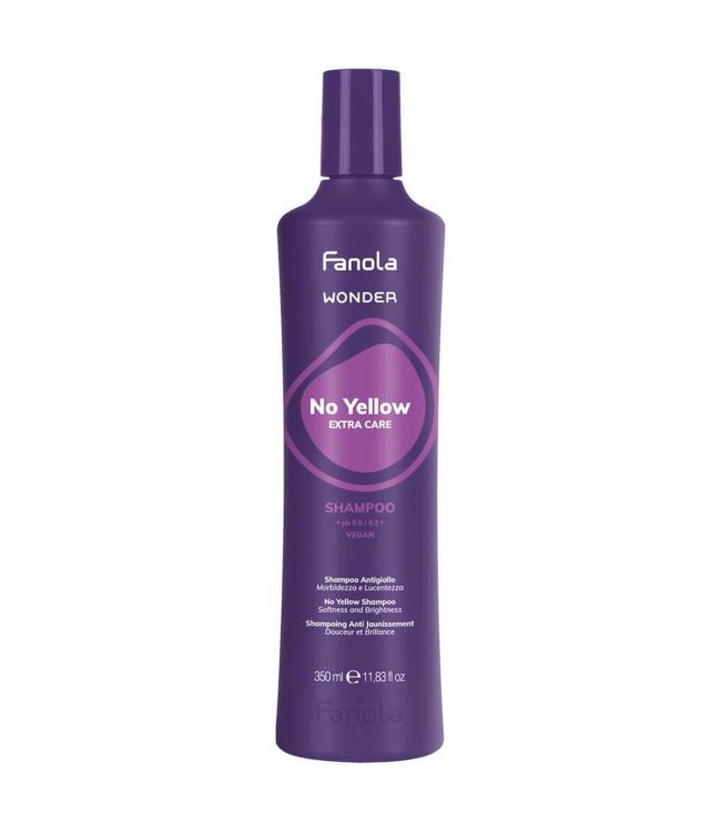 Fanola Wonder No Yellow Extra Care Shampoo 350ml neutraliseert ongewenste gele tinten en geeft het haar extra zachtheid en glans. De verrijkte formule van No Yellow Extra Care maakt blond, geblondeerd of grijs haar weer fris, gezond en glanzend. De formule bevat violet pigment om ongewenste gele warmte te neutraliseren en direct te tonen voor een cool resultaat. Geschikt voor volledig blond of grijs haar en voor haar met highlights. De zon, vervuiling, chemische behandelingen en stylingtools kunnen de glans van blond haar en de tint aantasten, die na verloop van tijd gelig kan worden. Wonder No Yellow Shampoo neutraliseert ongewenste gele tinten en voert een onmiddellijke toning actie uit. De verrijkte formule houdt het haar zacht en extra glanzend. Na het aanbrengen van het product is blond haar weer als nieuw en ziet het haar er gezond en vitaal uit. Fanola Wonder No Yellow Extra Care Shampoo is 100% veganistisch en heeft een pH waarde van 5.0/5.5.