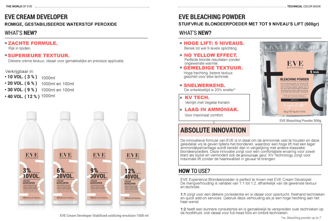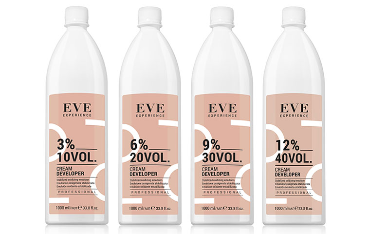 De Cream Developers van FarmaVita EVE Experience hebben een romige crème textuur en gaan perfect samen met de EVE Experience kleuren en blondeerpoeder. De Cream Developers hebben een zachte formule die rijk is aan lipiden. De romige crème textuur zorgt voor een goede hechting en gemakkelijke, precieze applicatie. De Cream Developers van EVE zijn 10 VOL (3%), 20 VOL (6%), 30 VOL (9%) en 40 VOL (12%). Ga voor een mengverhouding van 1:1 voor een dikkere textuur die perfect is voor openlucht en free-hand technieken of kies voor een mengverhouding van 1:2. Deze dunnere consistentie is ideaal voor full-head foils, ombré technieken en toepassingen op de hoofdhuid.