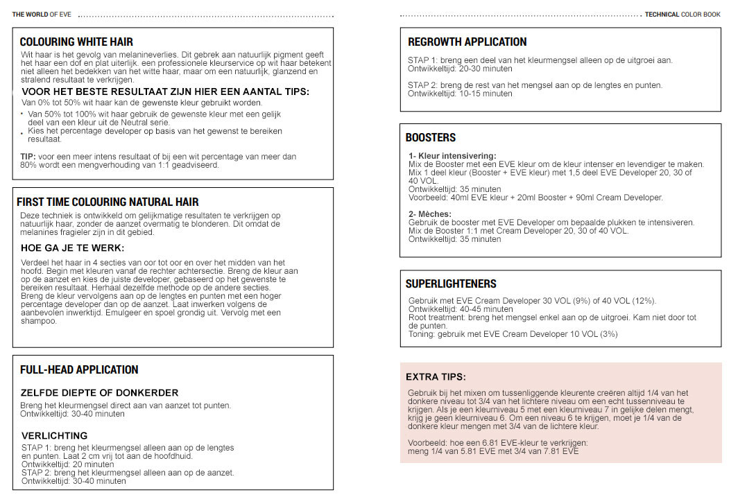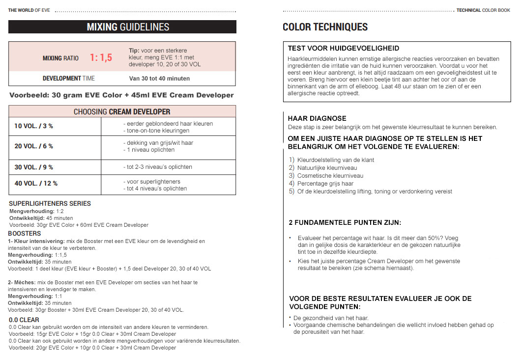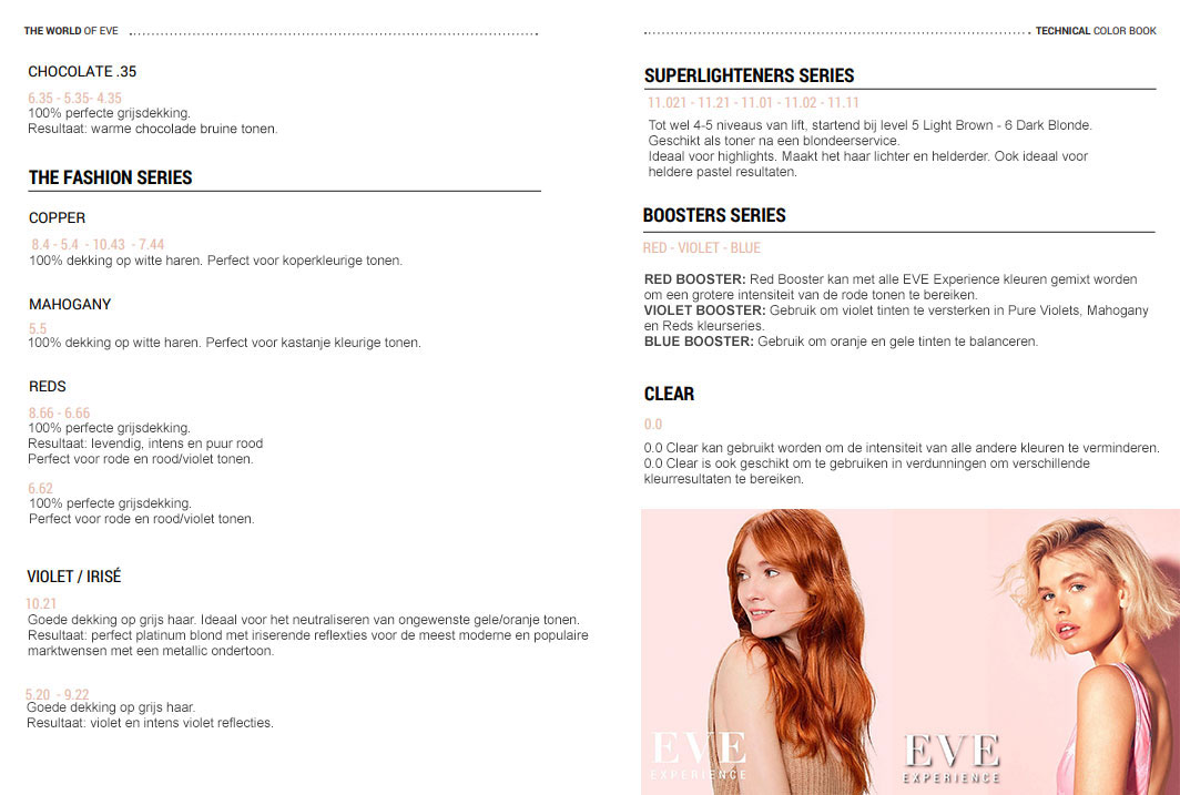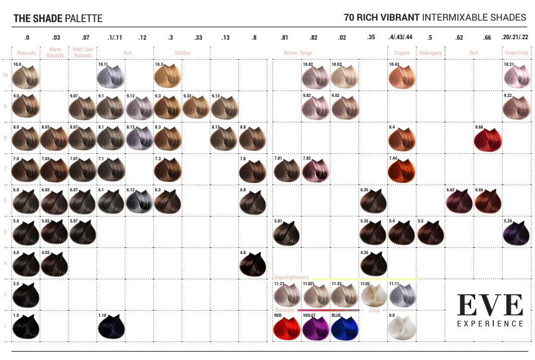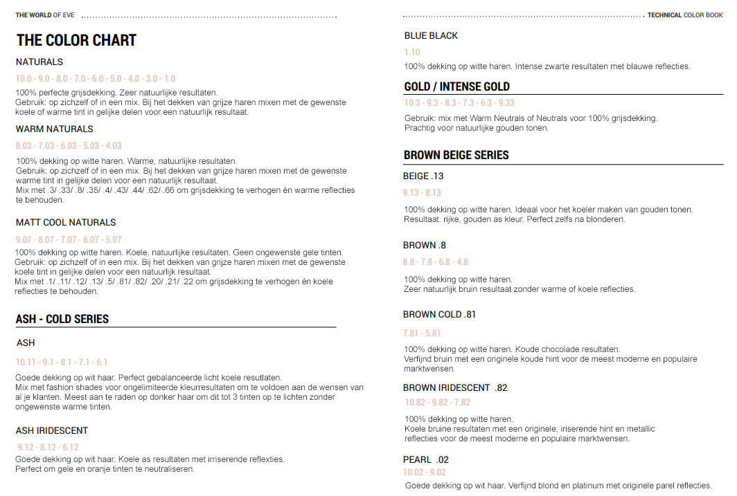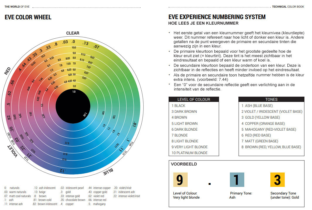 Het kleurassortiment van FarmaVita EVE Experience bestaat uit 70 levendige en onderling mengbare kleuren. Het assortiment bestaat uit Neutrals, Warm Neutrals, Matt Cool Neutrals, Ash, Golden, Brown, Beige, Copper, Mahogany, Red, Violet/Irisé, Superlighteners, Boosters en een Clear. Om de juiste kleur voor de wensen van iedere klant te selecteren is het handig om het nummeringssysteem van EVE Experience beter te bestuderen. Hieronder hebben we het kleurenwiel met informatie over het nummeringsstysteem op kleurnummer én op kleurtoon verzameld. Ontdek meer over alle kleuren van FarmaVita EVE Experience en hun primaire en secundaire tonen. Zo beschik je over de kennis en heb je houvast om de perfecte kleur aan te bieden voor de wensen van iedere klant.