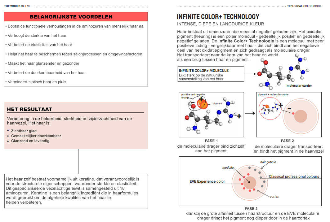 INFINITE COLOR+ TECHNOLOGIE: het haar bestaat uit aminozuren die meestal negatief geladen zijn. Infinite Color+ Technology bevat zeer positief geladen moleculen die zich binden aan de negatieve delen van het oxidatiepigment in het haar. De technologie werkt als een brug tussen pigment en haar met als resultaat een verhoogde kleurafzetting met +75% langer blijvende kleur (na 5 wasbeurten), +23% diepere kleurintensiteit en 100% grijsdekking.