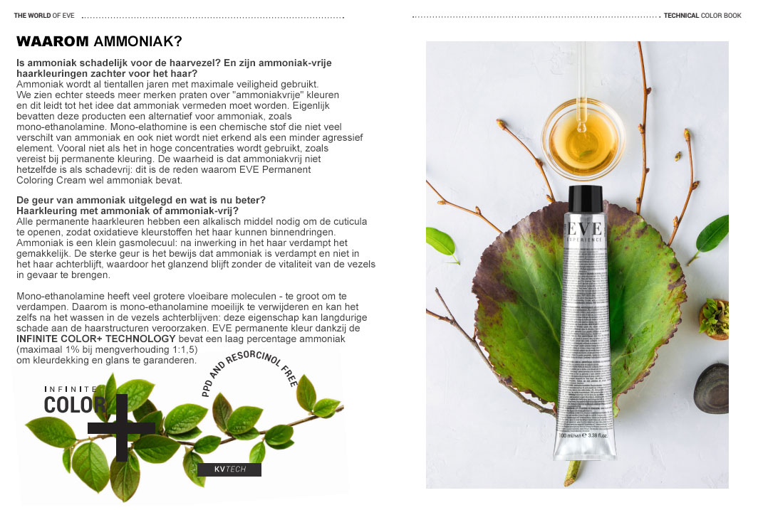 Ammoniak is een alkalisch middel wat nodig is in permanente haarkleuring om de cuticula te openen, zodat oxidatieve kleurstoffen het haar kunnen binnendringen. Ammoniak-vrije kleuringen bevatten een alternatief voor ammoniak, zoals mono-ethanolamine, om de cuticula te openen. Mono-ethanolamine is een chemische stof die niet veel verschilt van ammoniak en ook niet erkend is als een minder agressief ingrediënt. Vooral niet als het in hoge concentraties wordt gebruikt, zoals vereist bij permanente kleuring. Ammoniakvrij is niet hetzelfde als schadevrij: dit is de reden waarom EVE Permanent Coloring Cream wel ammoniak bevat om kleurdekking en glans te garanderen. Bovendien bevat EVE Experience slechts een laag percentage ammoniak dankzij de INFINITE COLOR+ TECHNOLOGY. Bij een mengverhouding van 1:1,5 is het percentage ammoniak maximaal 1%.