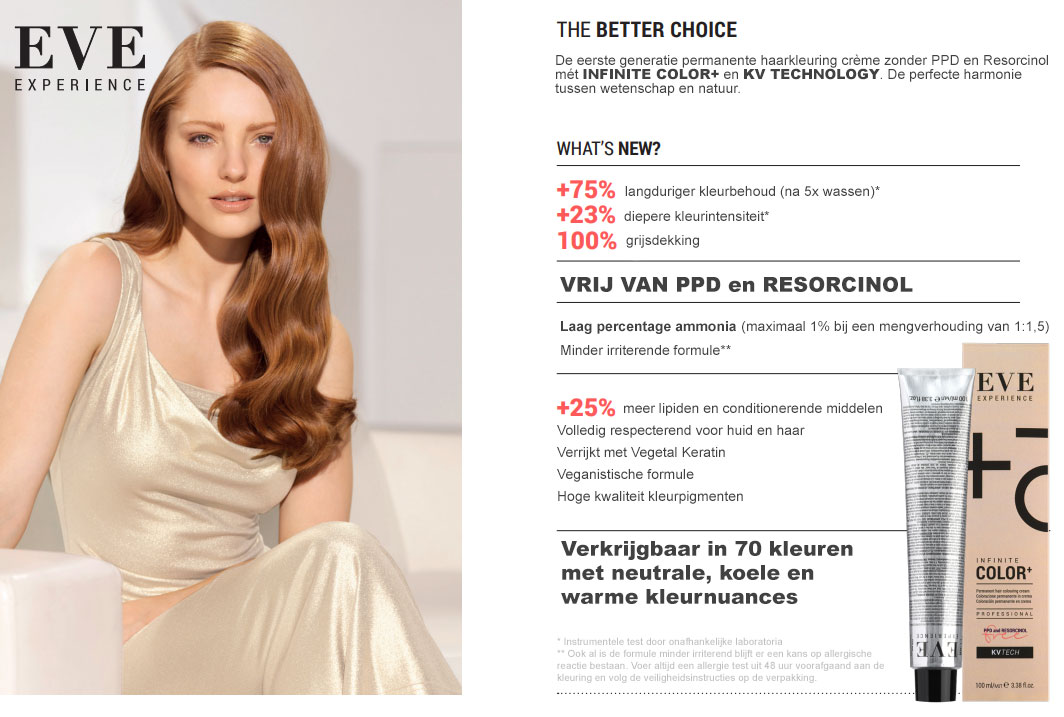 FarmaVita EVE Experience is een haarkleuring met een schone formule, vrij van PPD, Resorcinol en met een laag percentage ammoniak. De formule is verrijkt met Infinite Color + Technology voor intense, diepe en long-lasting haarkleuringen die tot wel 75% langer blijven zitten dan vergelijkbare kleuren. Deze technologie zorgt bovendien ook voor 100% grijsdekking. FarmaVita EVE Experience is een zachte en veilige formule die zowel voor klanten als stylisten een echte aanwinst is.