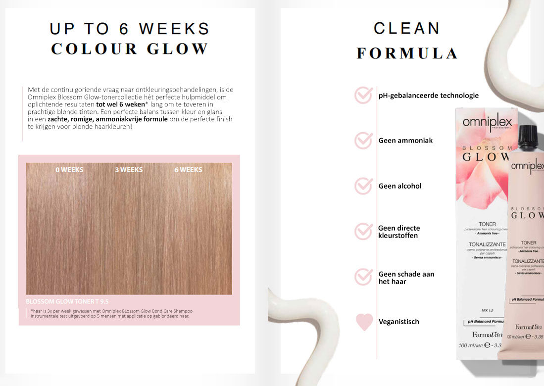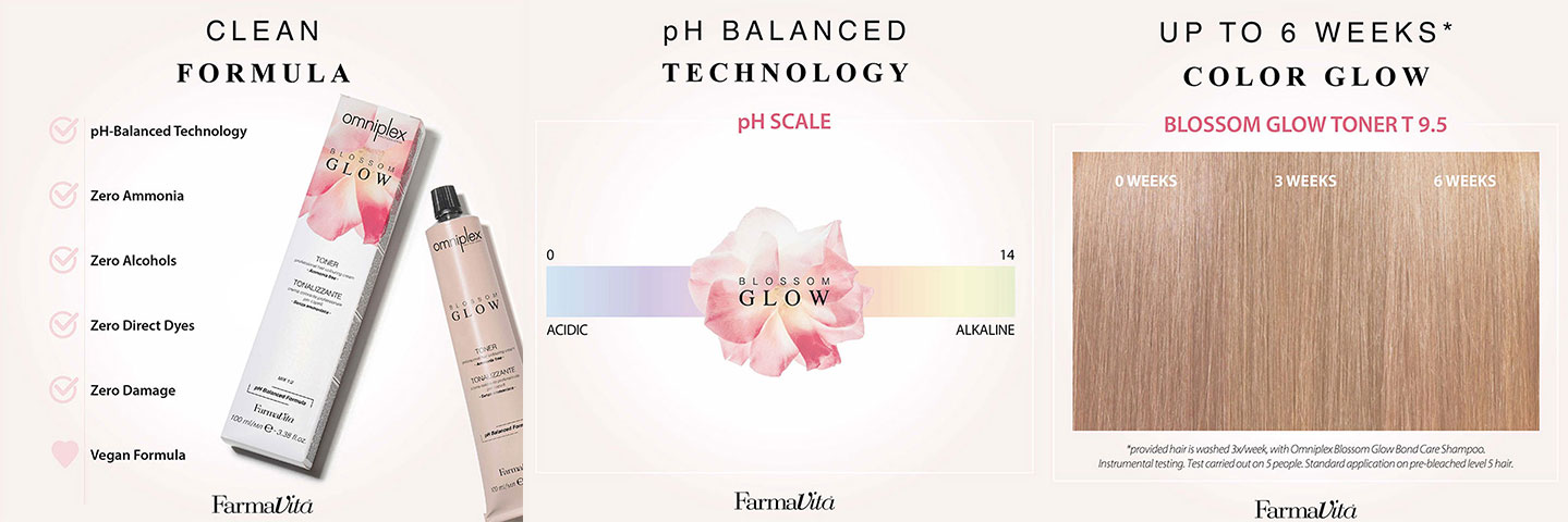 De producten van Blossom Glow vallen onder de Omniplex collectie van FarmaVita en zijn dan ook verrijkt met de bonding technologie van Omniplex en met Vegetal Keratine. Deze combinatie houdt het haar sterk en biedt bescherming tijdens het kleuren. Het resultaat is gezond, glanzend en langdurig gekleurd haar.