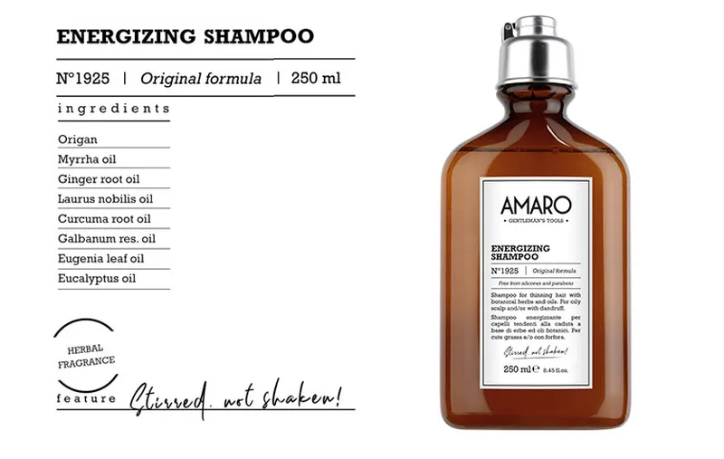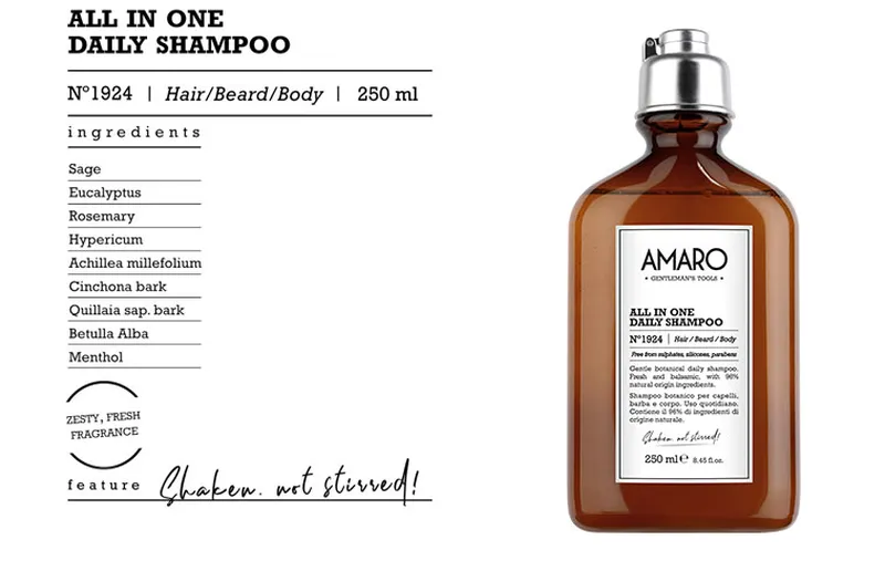 De shampoo's van Amaro zijn samengesteld uit botanische extracten zoals eucalyptus, salvia en rozemarijn met uitstekende reinigende eigenschappen. De ene is een dagelijkse shampoo die ook voor baard en lichaam geschikt is. De andere zorgt voor meer body in het haar waar nodig. Beide shampoo's zijn zacht voor het haar en de hoofdhuid.