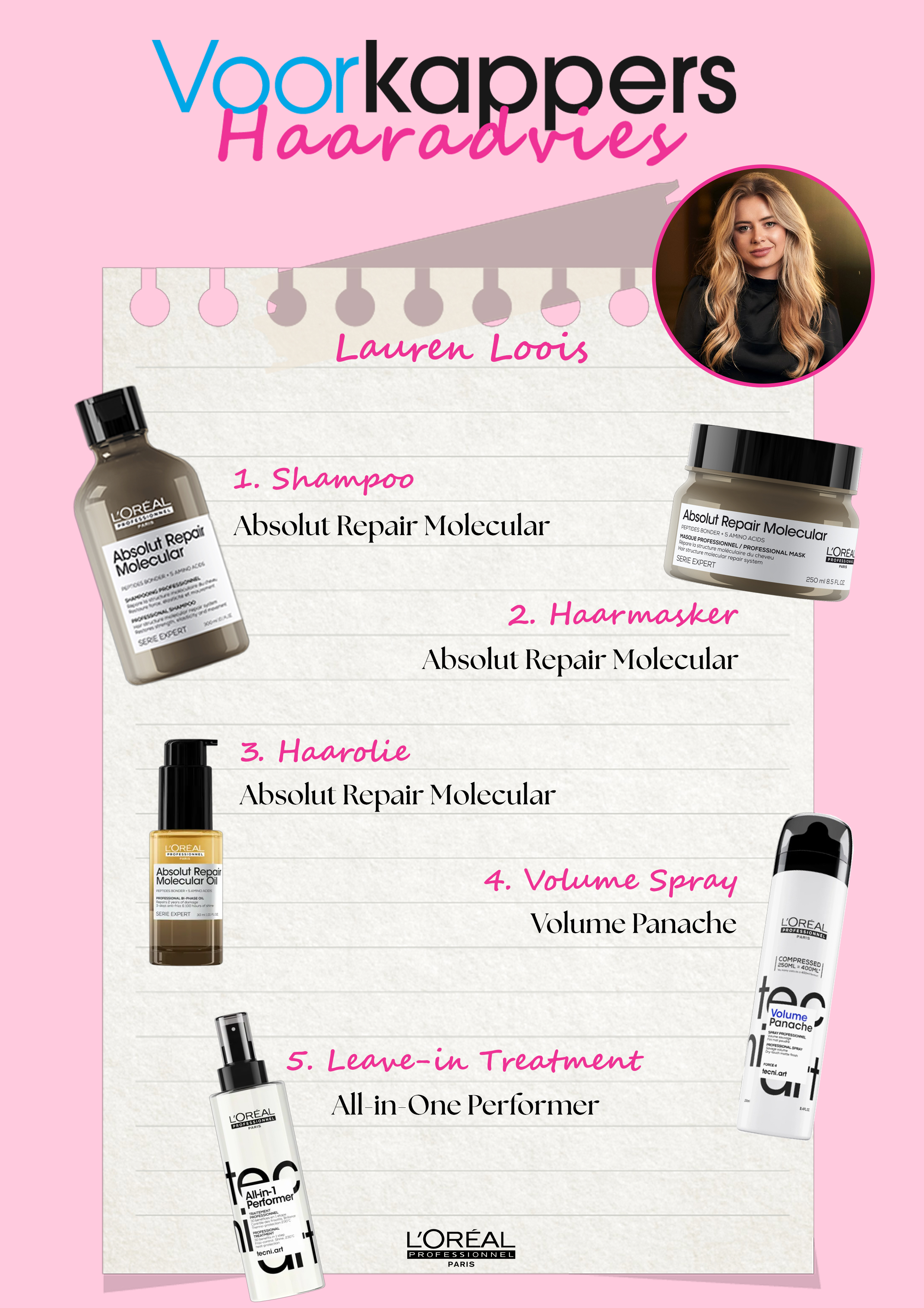 De experts van Voorkappers hebben met de producten van L'Oréal Professionnel de perfecte haarroutine samengesteld voor Lauren Loois. Hieronder kun je stap voor stap het haaradvies bekijken. Wil je ook producten van L'Oréal Professionnel shoppen? Gebruik code LAUREN10 voor 10% korting op het hele assortiment van L'Oréal Professionnel! Deze code is tijdelijk geldig op vrijdag 17 april 2026. Zie Laurens Instagram story voor de voorwaarden.