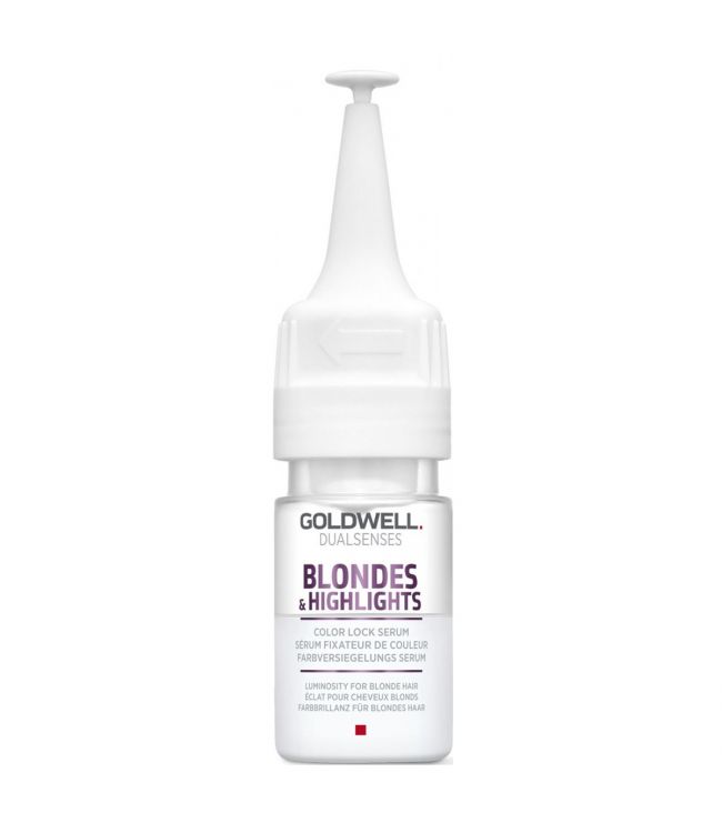 Goldwell Dualsenses Blondes & Highlights Serum 18ml is een treatment voor blond haar. Het serum legt een licht-doorlatend laagje om elke afzonderlijke haarschacht om de haarkleur te verzegelen. Goldwell Dualsenses Blondes & Highlights Serum is het perfecte serum direct na een kleurbehandeling of tussen twee kleurbehandelingen in. Het serum zorgt voor kleurvergrendeling tot wel 22 wasbeurten en is geschikt voor geblondeerd haar en haar met highlights. Het serum is ook geschikt voor natuurlijk blond, door de zon opgelicht haar. De unieke Luminescine kleur technologie verandert onzichtbaar UV-licht in zichtbaar licht op het haar voor een prachtige briljantie. De Blondes & Highlights lijn neutraliseert ongewenste geeltinten in het haar voor mooie, koele resultaten.