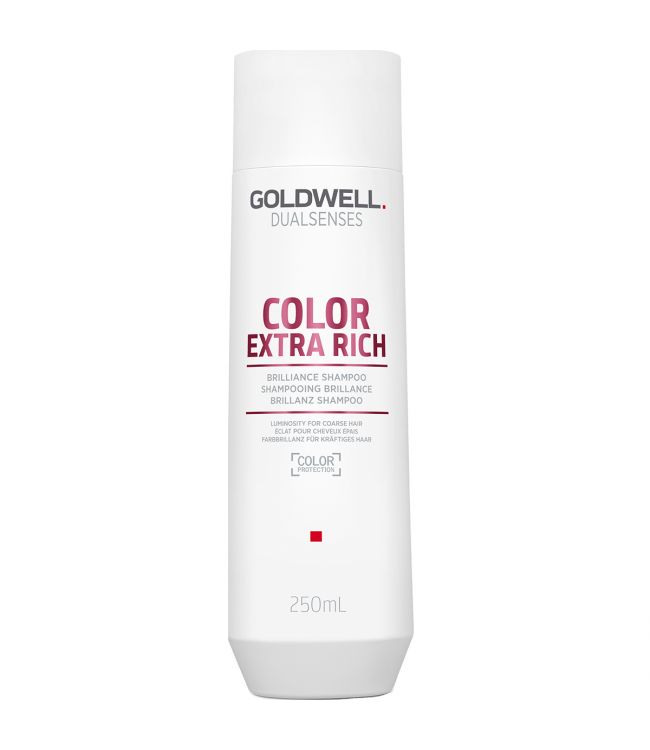 Goldwell DualSenses Color Extra Rich Brilliance Shampoo 250ml is een gewichtloze verzorging voor dik to weerbarstig en gekleurd haar. De shampoo heeft een verfrissende formule die onzuiverheden wegneemt en de kleurglans op zowel gekleurd als niet gekleurd haar doet herleven. De shampoo reduceert kleurverlies tot een minimum dankzij de Fade Stop Formula met kleurbeschermende granaatappel-essence. De Goldwell Color Extra Rich Brilliance shampoo reinigt mild en zacht en houdt de haarkleur levendig. Goldwell Dualsenses Color Extra Rich bevat Luminescine technologie, wat onzichtbaar UV-licht omzet in een prachtige briljante glans op het haar.