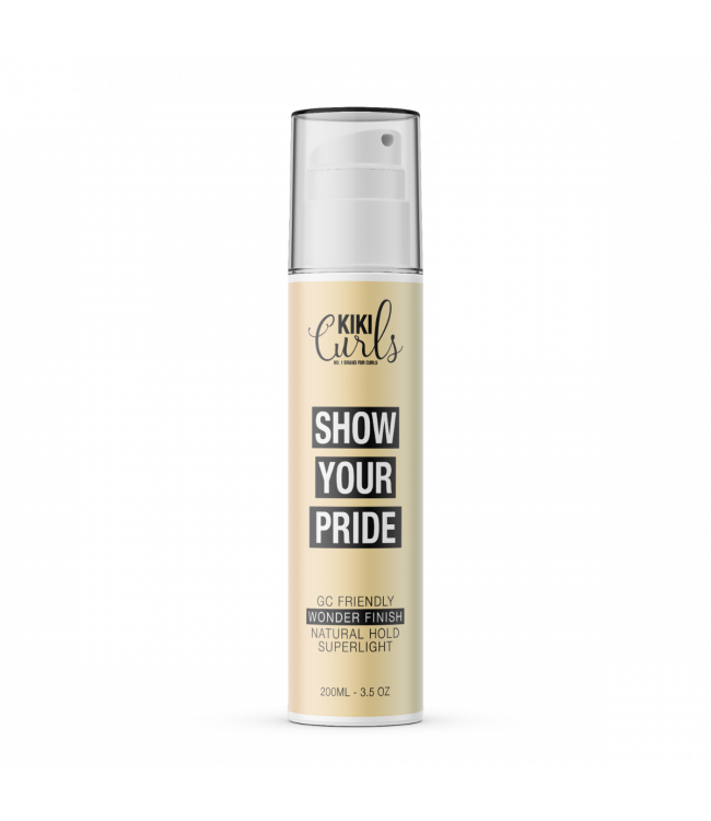 Kiki Curls Show Your Pride Wonder Finish 200ml is een curl activator cream die het haar ontwart, versterkt, definieert en ontpluist, zonder te verzwaren. Deze finish geeft het haar een mooie glans en beschermt het haar tegen hitte. De Wonder Finish houdt de krullen onder controle en behoud een natuurlijk gevoel. De Wonder Finish curl activator cream lijkt op Kiki Curls Stap 4 Curl Control. Waar de #3 Wonder Finish een natuurlijke hold geeft zorgt #4 Curl Control voor meer stevigheid en details aan de krullen. Kiki Curls Wonder Finish is 100% geschikt voor de Curly Girl Methode. CG-friendly producten zijn vrij van sulfaten, siliconen (op oliebasis), minerale oliën, wax en uitdrogende alcohol. De Kiki Curls Show Your Pride Wonder Finish Cream is speciaal ontworpen voor alle krultypes en proteïne-vrij.