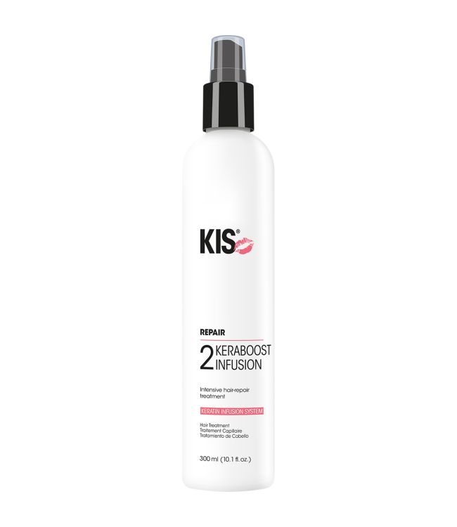 Kis Keraboost Infusion 300ml is een zeer geconcentreerde kuur booster. Dit is stap 2 in het Keratin Infusion Treatment. Kis KeraBoost bevat een mix van keratine aminozuren met een moleculair gewicht van 150, gecombineerd met kationische enzymen. Deze bouwen het haar van binnenuit weer op en geven het zijn oorspronkelijke kracht terug. Hierdoor blijven eventuele kleuringen en andere chemische behandelingen langer mooi. Kis KeraBoost Infusion Spray is geschikt voor wekelijks gebruik en heeft een pH-waarde van 5.0 - 5.5.