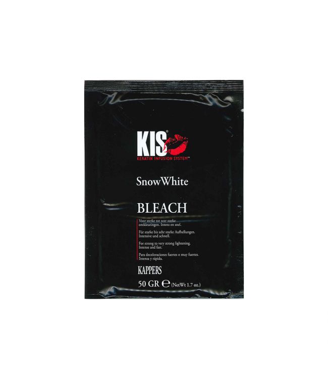 Kis Snowwhite Blondeerpoeder 50gr is een blondeerpoeder die uniek is door de fantastische resultaten en het verzorgende effect op het haar. De stuifvrije blondeerpoeder is geschikt voor sterke en zeer sterke ontkleuringen en werkt intens en snel. Het Keratin Infusion System in de SnowWhite blondeerpoeder beschermt en versterkt het haar maximaal tijdens het blonderingsproces. Het blondeerpoeder neutraliseert de ongewenste warme tonen in het haar voor gegarandeerd heldere blond tinten als resultaat. Kis SnowWhite Bleach licht het haar tot wel 7 tinten op en is geschikt voor de meest uiteenlopende technieken. Van coupe-soleil tot de laatste blondering trends.