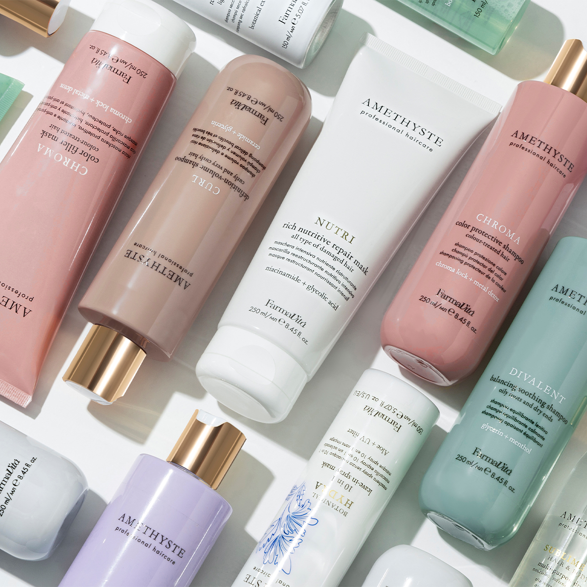 FarmaVita Amethyste is een specialistische productlijn, geïnspireerd op skin care. Amethyste is ontworpen om een exclusieve sensatie aan te bieden in de salon en om de ware schoonheid van het haar te laten stralen. De specialistische haarverzorgingsproducten pakken diverse haarproblemen direct bij de kern aan. Denk hierbij aan roos, vet haar en/of een vettige hoofdhuid, slap en futloos haar en het voorkomen en bestrijding van niet-erfelijke haaruitval. De producten van Amethyste hebben een uitgebalanceerde formule en zijn verrijkt met bewezen effectieve ingrediënten. Daarnaast biedt FarmaVita Amethyste ook een Coloring Mask Collection. Deze haarmaskers bevatten directe kleurpigmenten om de haarkleur te doen herleven. De formules zijn verrijkt met argan olie om naast kleur ook diepe verzorging te bieden. Amethyste Color Masks zijn verkrijgbaar in Copper, Red, Brunette, Silver en Blonde.