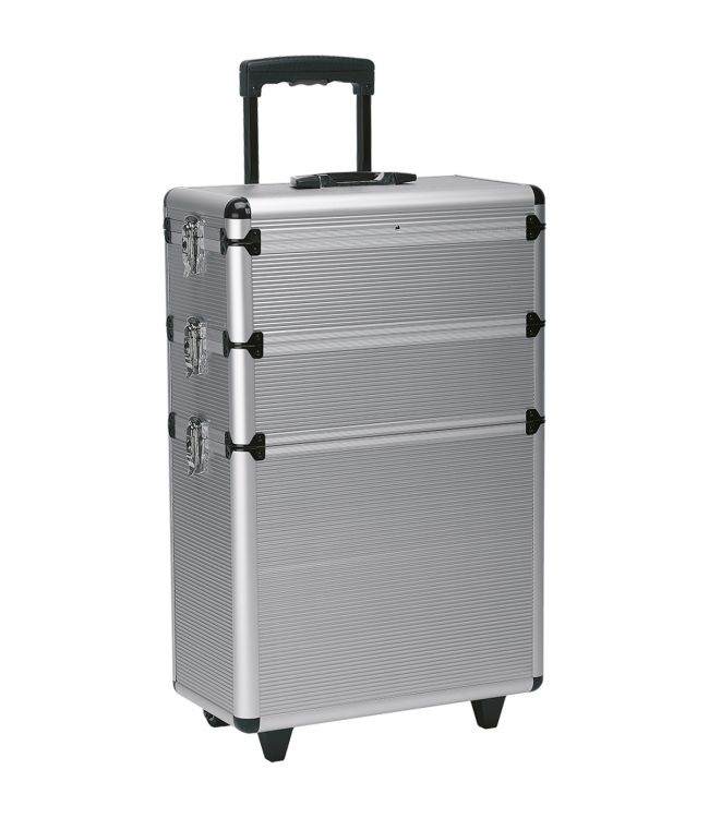 Bepaal zelf hoe groot de koffer dient te zijn naar gelang de behoefte, het deksel met handvat kan op elk van de 3 modulaire delen geplaatst worden waarmee een single module, een dubbele module of een triple module gemaakt kan worden. De onderste en tevens grootste module bevat 2 wieltjes en 2 pootjes. De 2 kleinere modules hebben geen wieltjes. Na het stapelen kunnen de aparte modules met een stevige clip sluiting aan elkaar worden vastgemaakt. Dankzij het uitschuifbare handvat laat deze aluminium koffer zich perfect als trolley gebruiken.