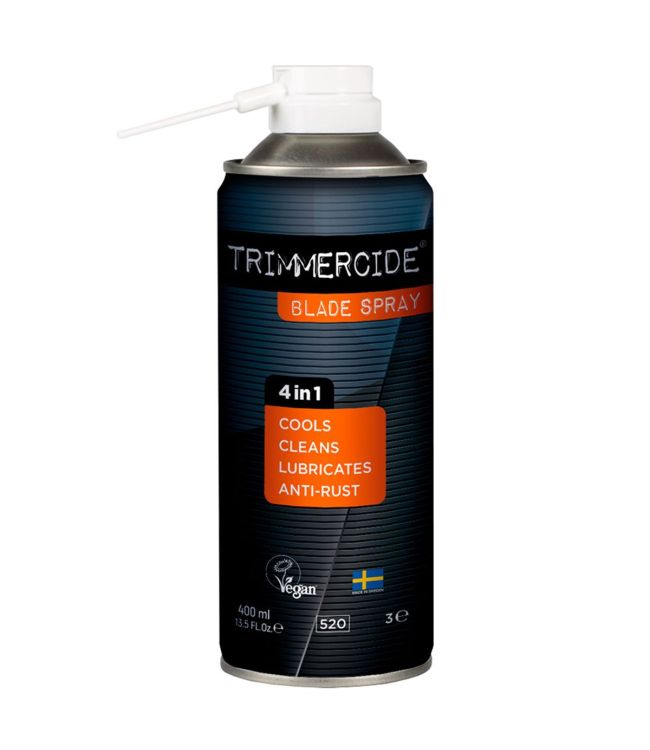Trimmercide Tondeuse Reiniging en Onderhoud Spray 400ml is een spray die tondeuses en trimmers schoon en koel houdt. Trimmercide-spray blaast haar, stof en deeltjes uit de messen en zorgt voor het smeren van de tondeusemessen tijdens het knippen en trimmen. De blade spray voorkomt roestvorming, beschermt de messen en verlengt de levensduur van de tondeuse of trimmer.