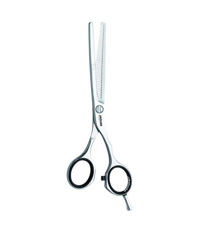 Neem als voorbeeld de Jaguar Solingen JP43 Effileerschaar 6.0. Deze schaar heeft getande bovenbladen en is ideaal voor een ontspannen werkhouding. Hieronder staat een foto van deze goedwerkende schaar.